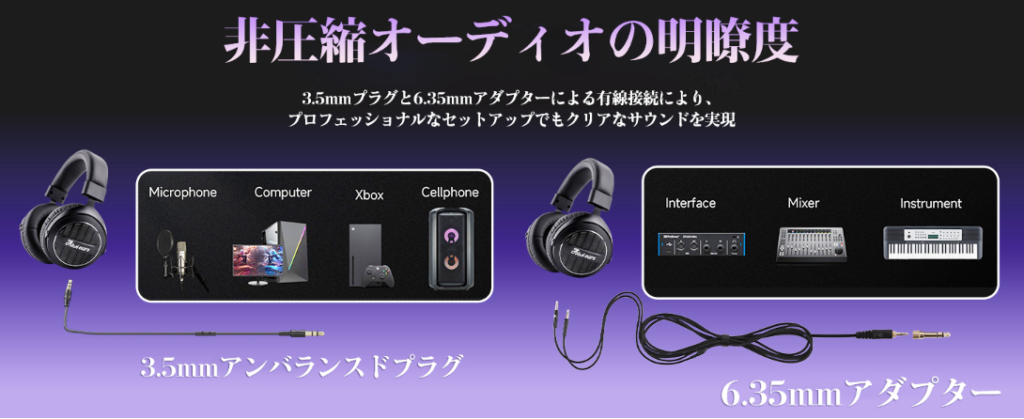 - 着脱可能な3.5mmケーブル+6.3mmアダプター付属